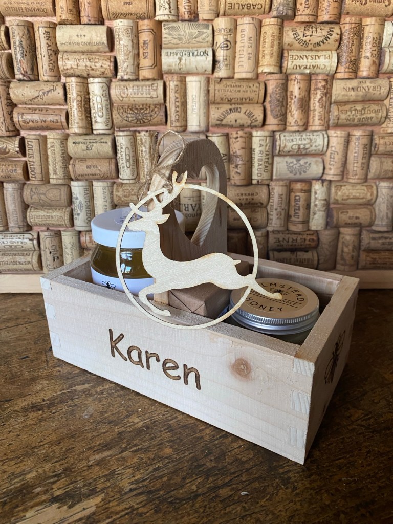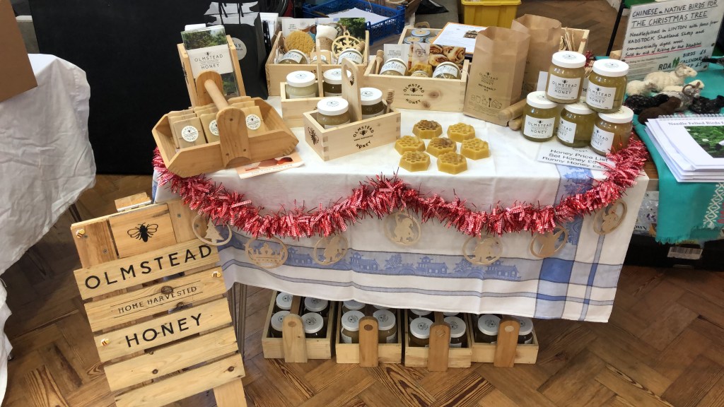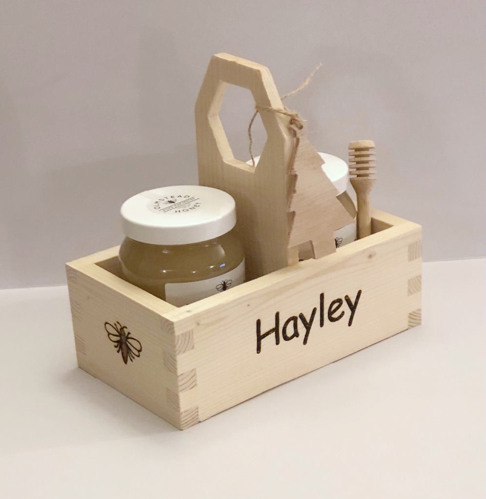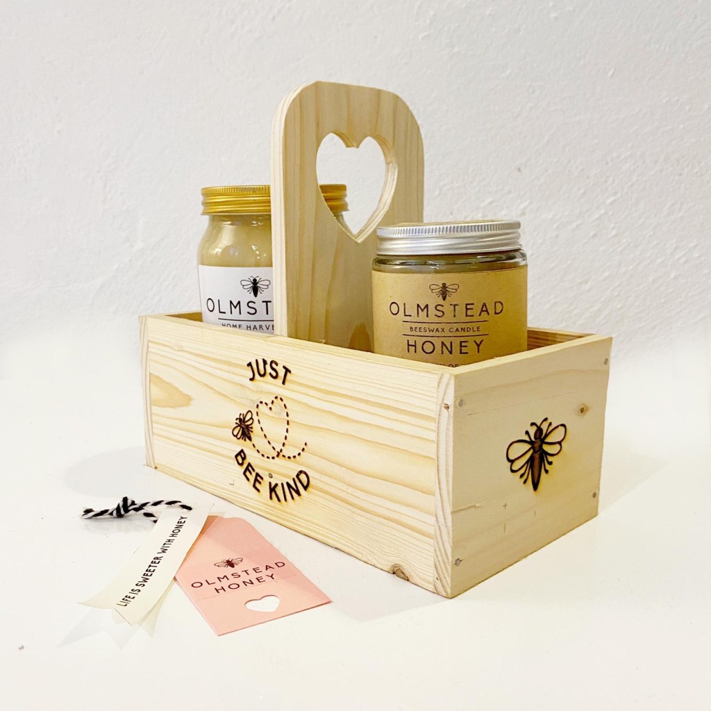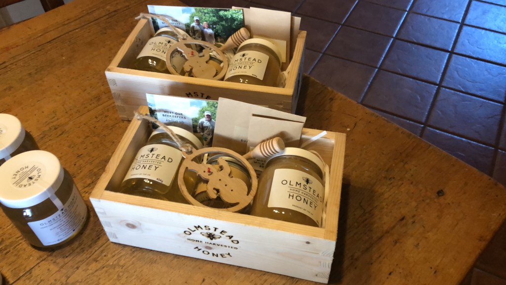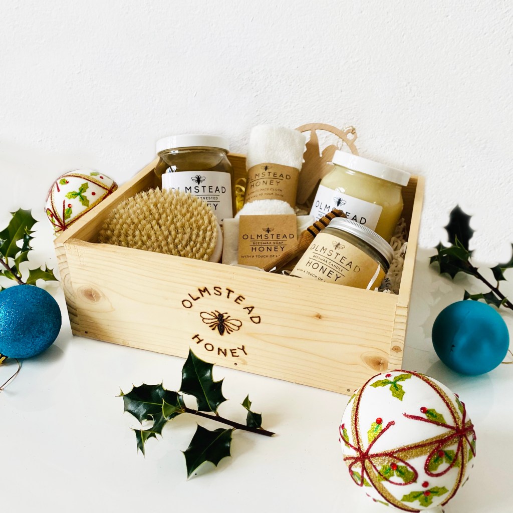 Give someone the gift of relaxation this christmas with our Olmstead Honey Pamper Pack including: 1 x runny honey 1 x set honey, one drizzler, 1 x natural clay soap, 1 x bamboo washcloth, 1 x body scrub brush and 1 x olmstead honey candle. All our christmas gift sets also include an information leaflet, 2 x recipe cards and a handcrafted wooden christmas ornament all made by our Olmstead Honey team. Orders being taken now. – collection from Olmstead Honey HQ.