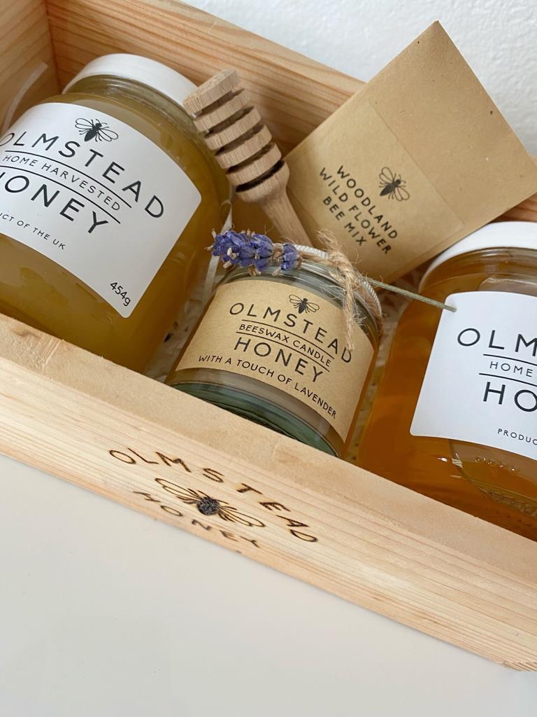 Runny or Set honey plus a Olmstead Honey beeswax candle
