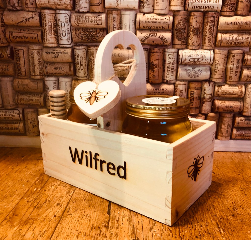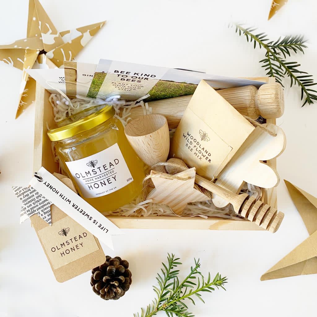 Including 1 x runny honey, 1 x drizzler, 1 x eggcup, 1 x pack wild flower seed, various information and recipe cards, 1 x Christmas decoration,